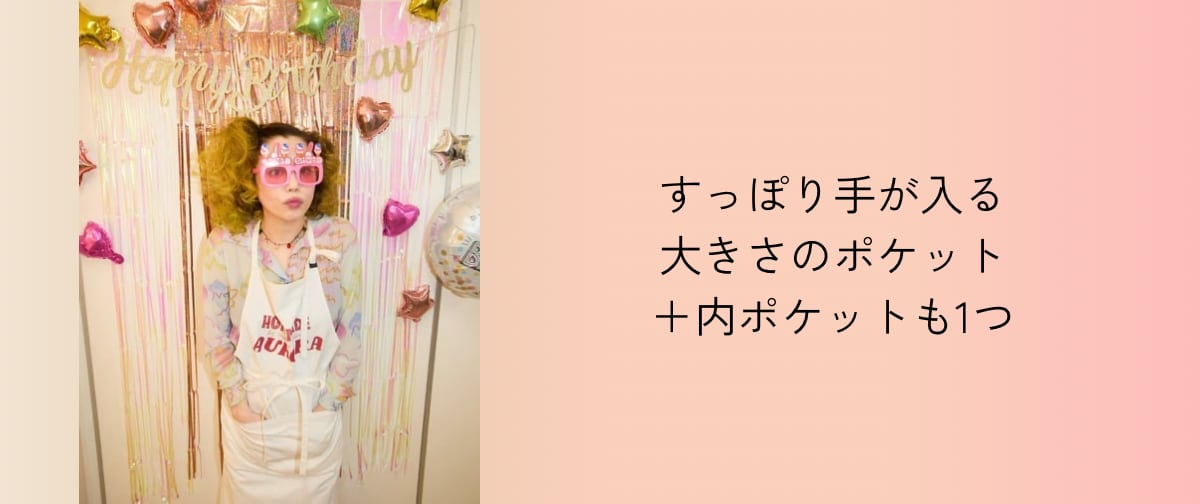 料理に、園芸に、掃除にそしてペットのお世話にもと毎日のようにエプロンを使うCharaならではの、こだわりのあるオリジナルエプロン。どんな体型でもフィットするユニセックスサイズのエプロンで、大きいポケットが欲しい!というCharaの希望に応えた、大きい2ポケットにポケット内ポケット、の合計3つのポケットが。そしてもちろん『可愛いロゴ』にもこだわりました。 素材:綿100% サイズ:約W104cm×H100cm