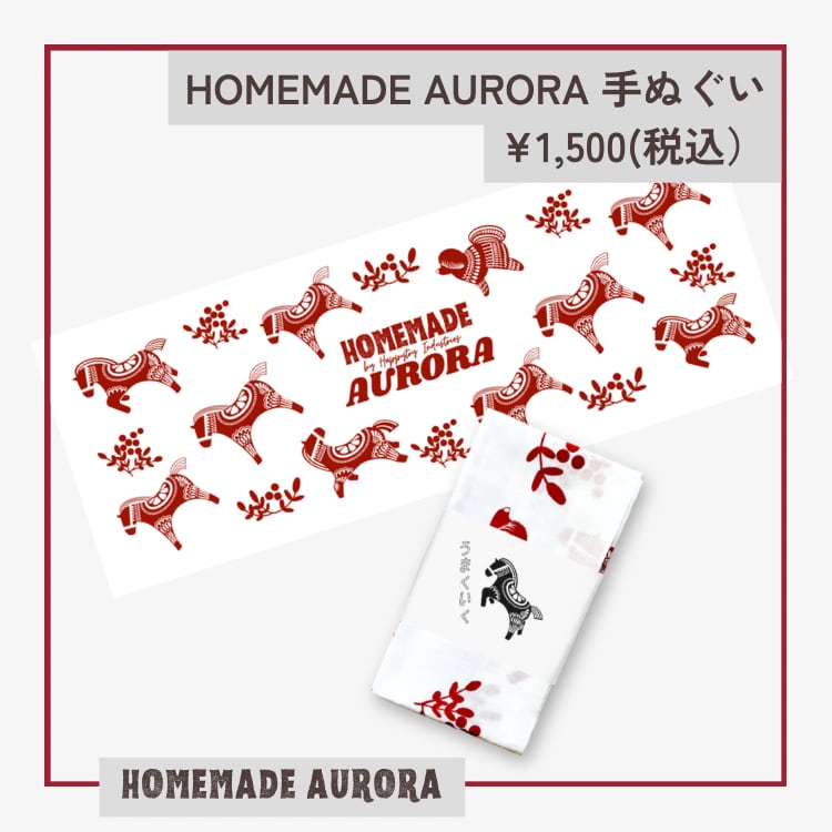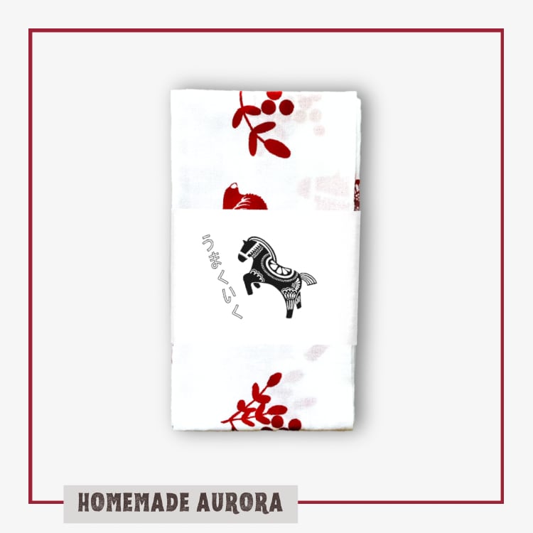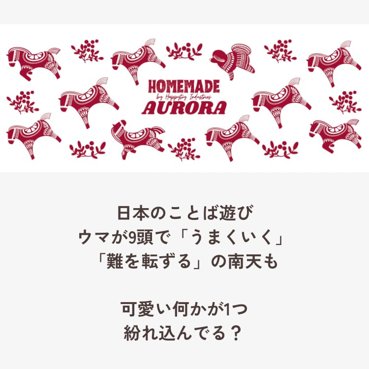 縁起の良いモチーフで作ったオリジナル手ぬぐい。「うまくいく」とかけて干支の馬が9頭、「難を転ずる」とかけて南天をデザイン化。なんだか可愛い、どこかで見たような動物も紛れ込んでます…? HOMEMADE AURORAの可愛いロゴも。